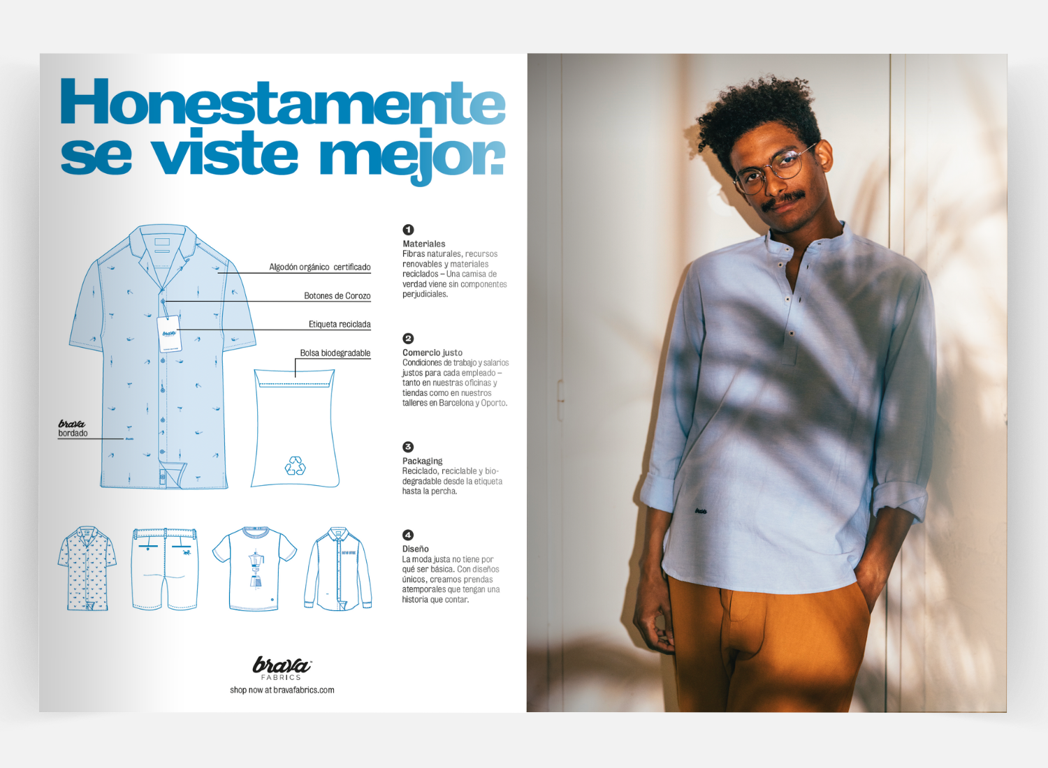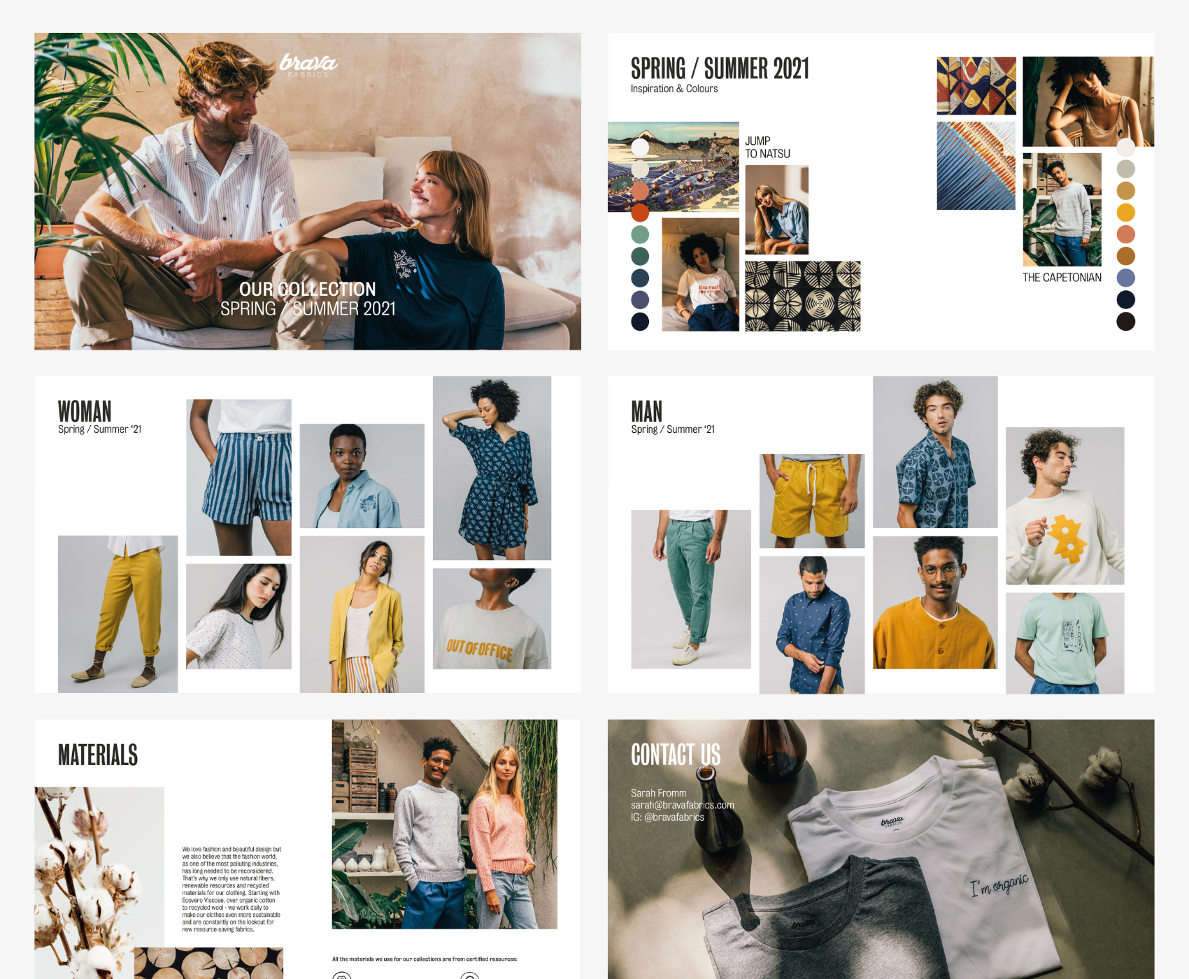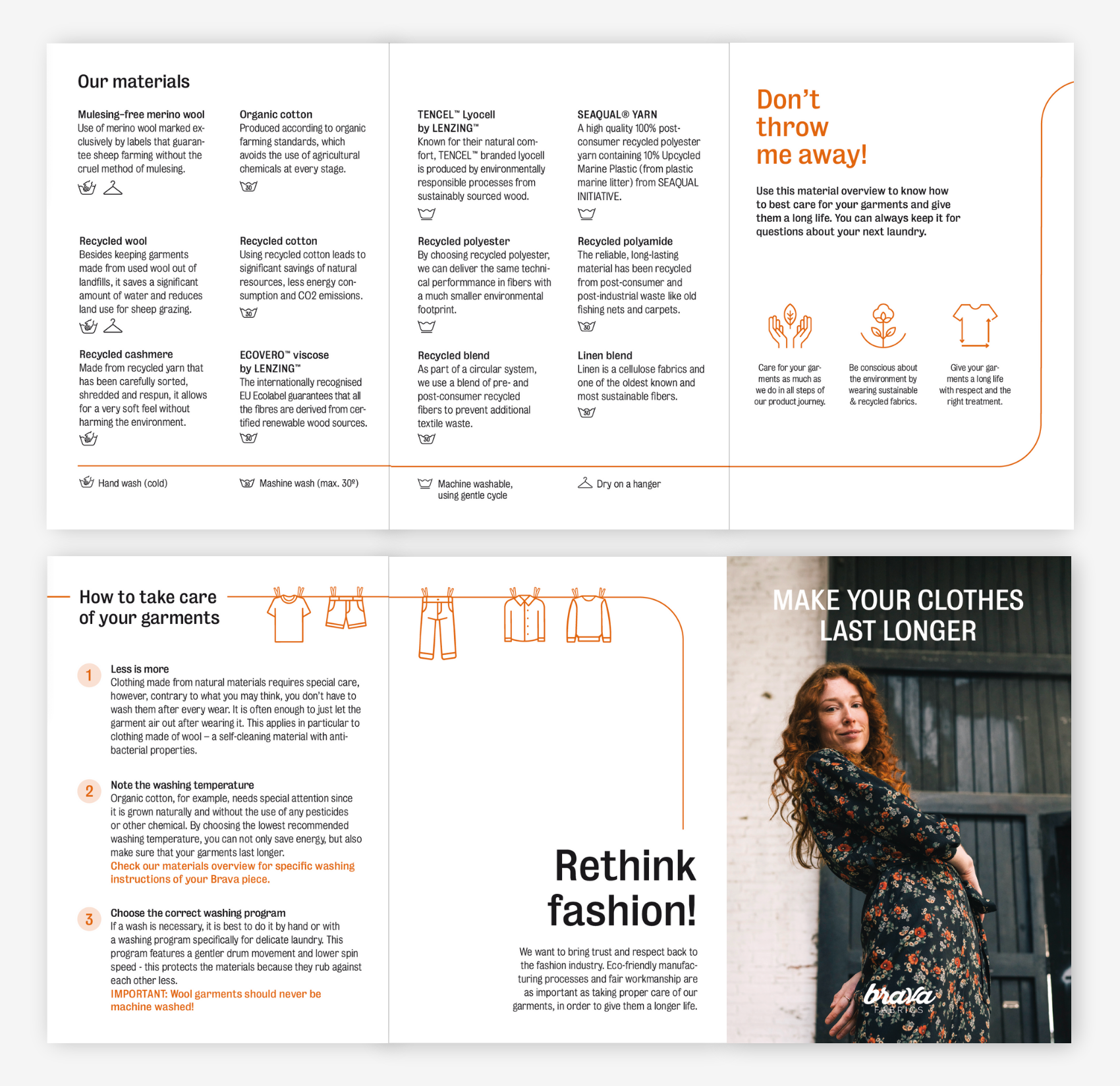 Darunter ein Flyer, der das Bewusstsein für die Pflege von Kleidung schärft, eine Zeitschriftenanzeige und eine Image-Präsentation, um potenziellen Influencern den Brava-Lifestyle zu vermitteln.